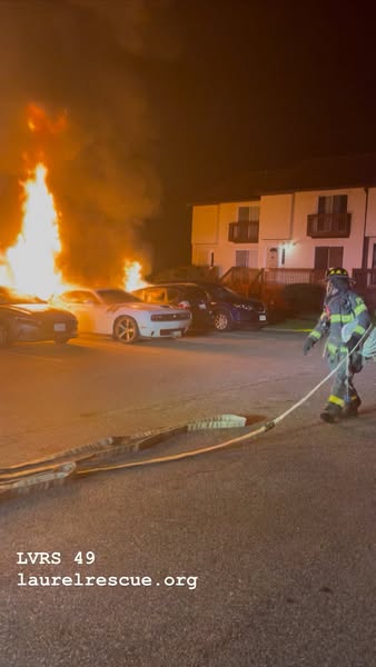 Upon arrival, crew found 3 cars fully engulfed in flames. While establishing a water supply, the chauffeur noticed a 4th car in another section of the parking lot partially engulfed in flames. Crew deployed a second attack line to knock down the fire.