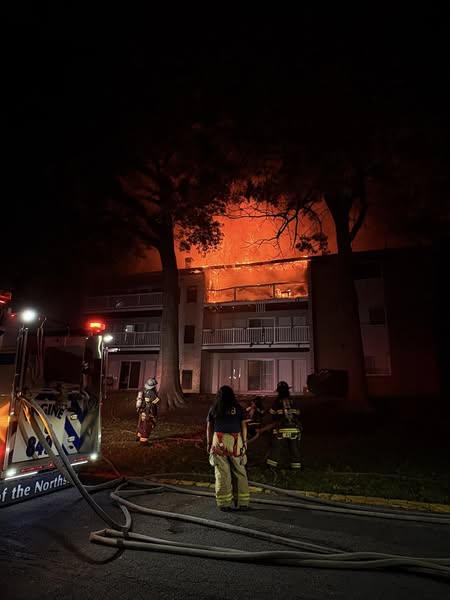 Engine 849 was dispatched as the first-due engine to the 8800 block of Hawthorne Lane for reports of an apartment fire. On arrival, crews found fire showing from the Charlie side of the building. A 400-foot attack line was deployed and advanced to the fire floor.
